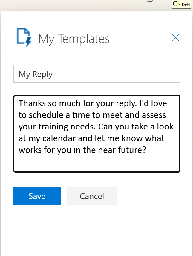 - Click the + Template button and name the template (my reply) and paste the text/images to be used and click Save.